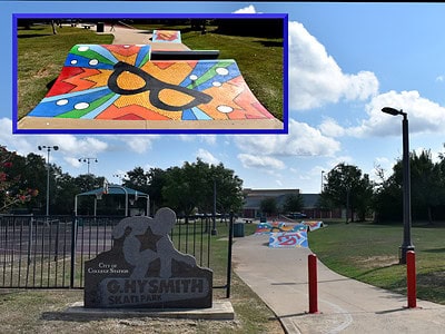 The G. Hysmith Skatepark just had a mural makeover! The skatepark is located in College Station, TX inside Brian Bachmann Community Park to the left of the Southwood Community Center.