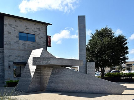 This large abstract monolith is an assemblage of blocks and trapezoids of patinated aluminum in two separate pieces. It is 22 ft high, 36 ft in width and 16 feet deep. Mesa was originally installed in November 2003 at the Arts Center building on Dartmouth St. It was the first sculpture installed there, then moved to its current location in 2018.